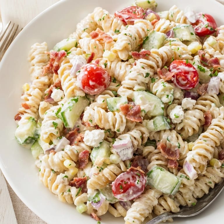 Save to Pinterest This creamy Alfredo Bacon Ranch Pasta Salad layers smoky crispy bacon and cool ranch with the richness of Alfredo sauce all tossed with fresh veggies and cheese. It is my go-to for potlucks and summer BBQs since it holds up perfectly and tastes like comfort in a bowl.