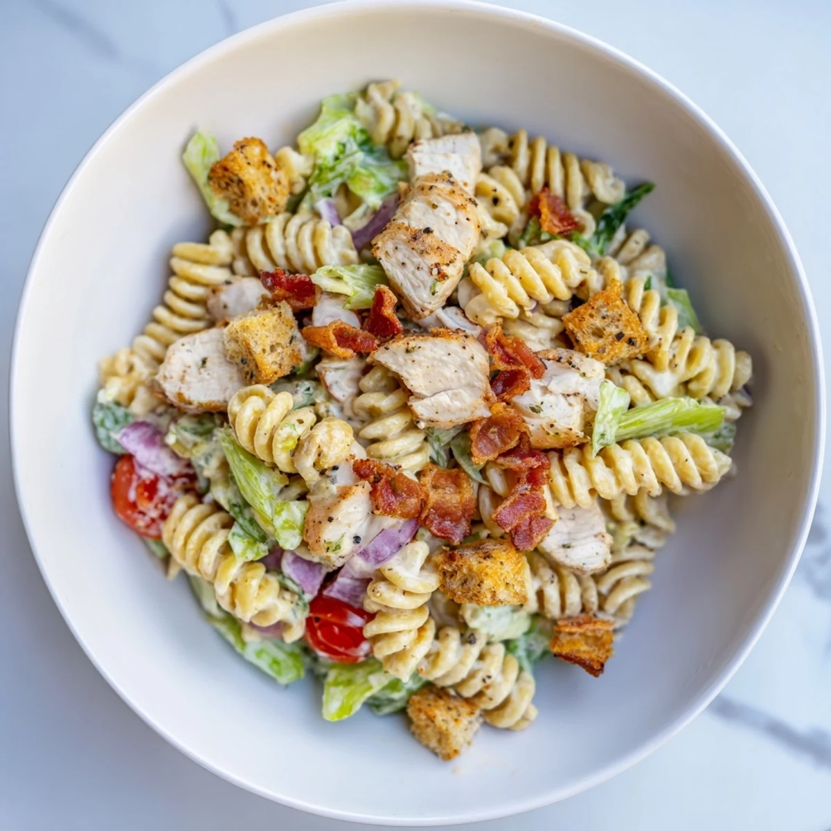 Most pasta salads are sides, but this one earns its place at the center of the plate because of the amount of protein—the grilled chicken and bacon make it substantial enough that you don't need anything else unless you're particularly hungry. The Caesar dressing is rich and satisfying, and the vegetables add just enough freshness to keep it from feeling heavy. The ratio of ingredients to dressing is generous but not excessive, so you're eating a balanced meal, not just mayonnaise with some pasta mixed in.
