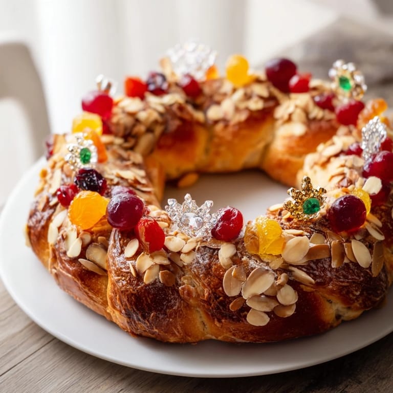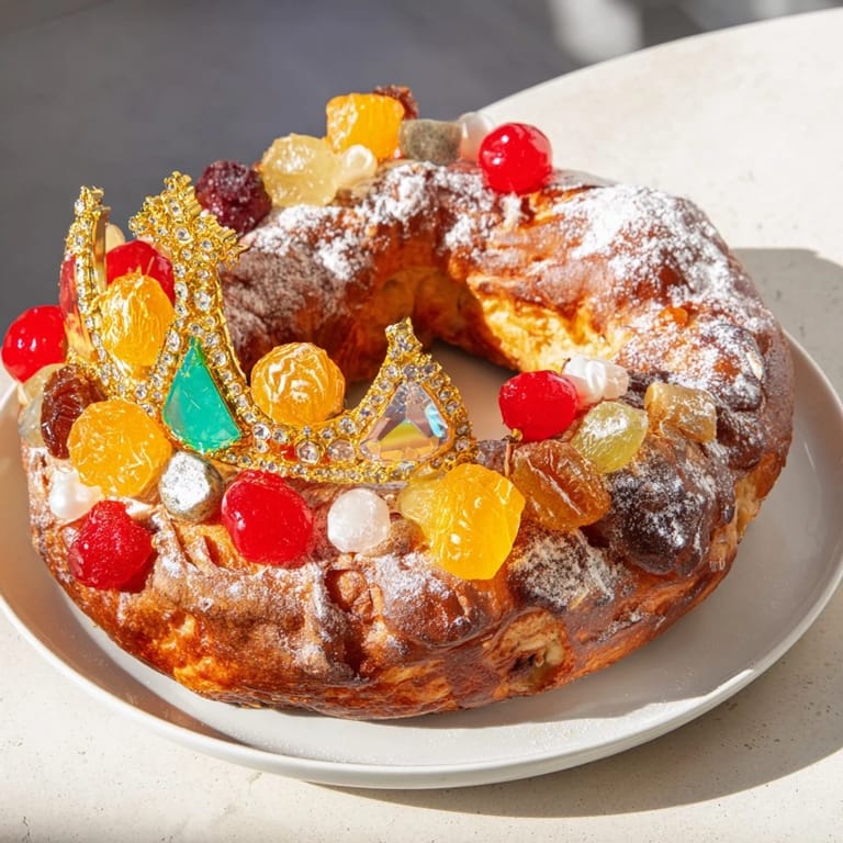 Save to Pinterest A festive and dazzling sweet bread shaped like a crown, adorned with colorful candied fruits and sugar pearls—a showstopping centerpiece perfect for celebrations.