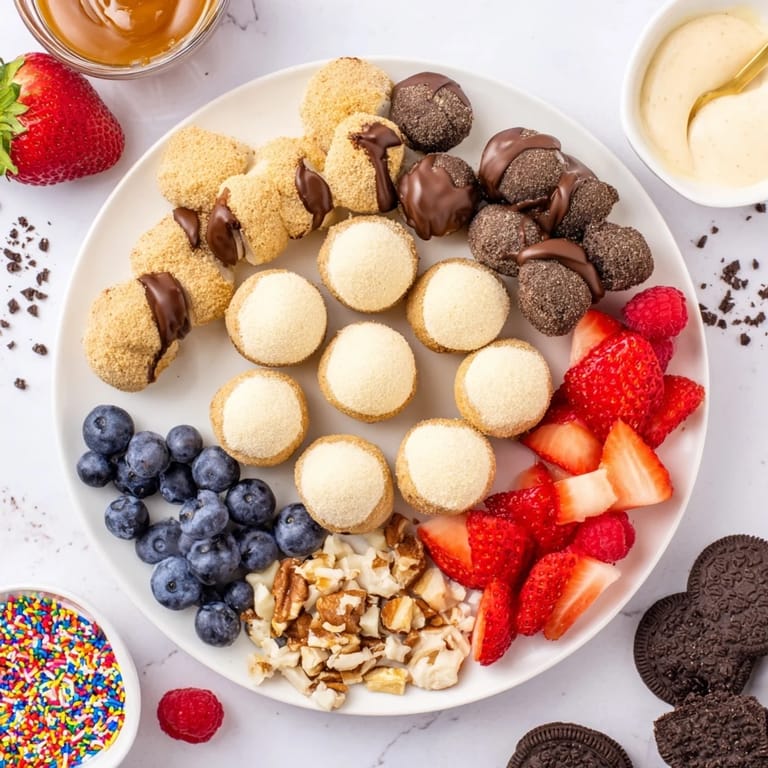 Save to Pinterest A show-stopping, interactive dessert board featuring creamy cheesecake bites and an array of delicious toppings for a customizable sweet experience.
