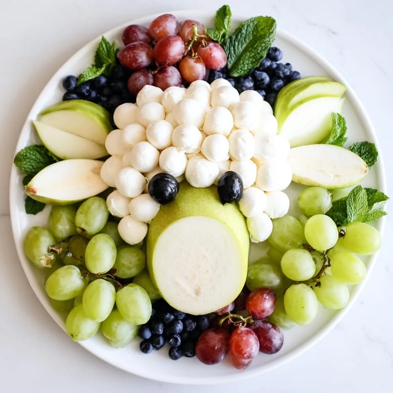 Save to Pinterest A charming and whimsical platter featuring fresh fruit and cheeses arranged to resemble a lambs face—perfect for baby showers and festive gatherings.