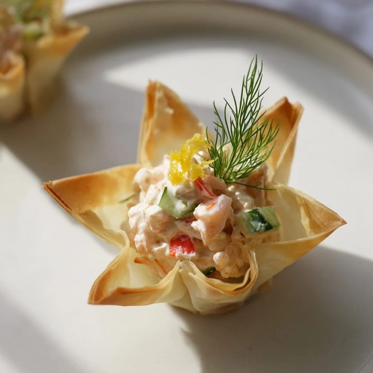 Save to Pinterest Delicate, crispy phyllo cups filled with a creamy, savory shrimp and vegetable salad, perfect for an elegant appetizer at any gathering.