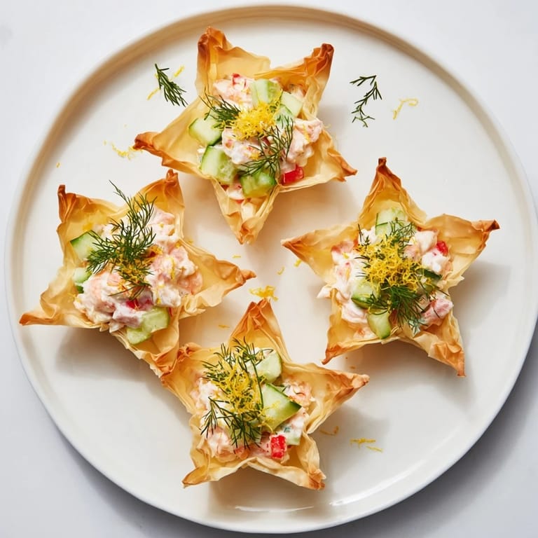 Spoon the filling into the cooled phyllo cups just before serving, then garnish with fresh dill sprigs and lemon zest for extra flavor.