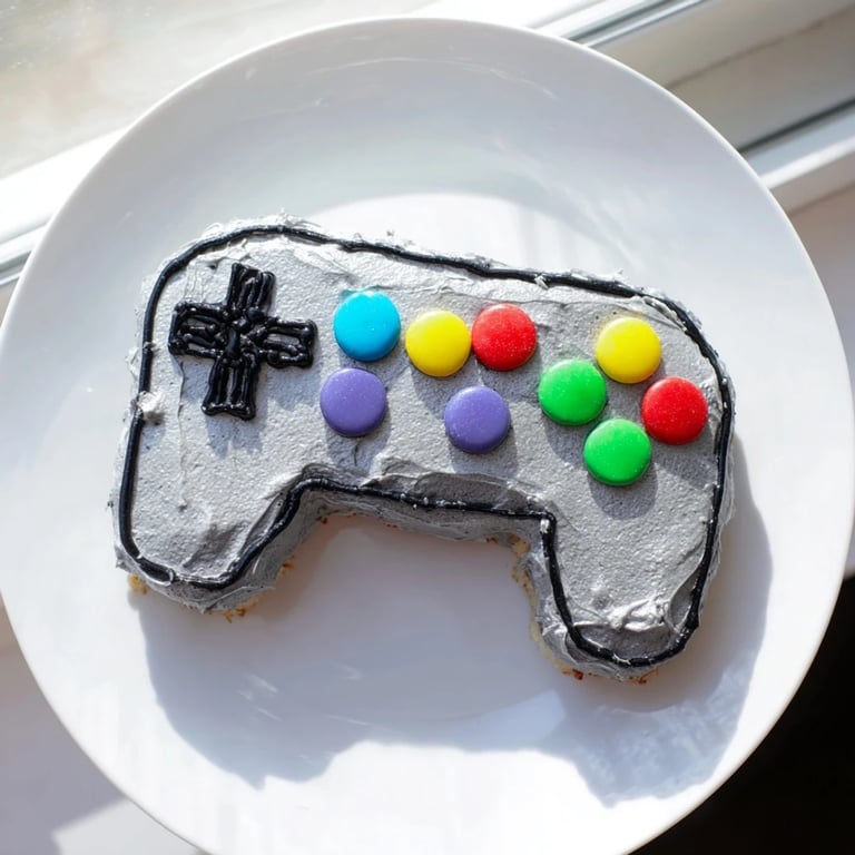 Save to Pinterest A playful, colorful cake designed to look like a classic video game controller, perfect for parties and gaming fans.