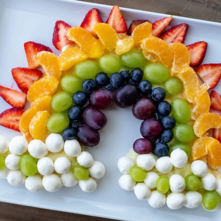 This snack board not only satisfies the eye but also provides balanced nutrition with natural sweetness and crunch. The cloud design, made from mini mozzarella balls or marshmallows, adds a playful touch to the rainbow arc of produce, inviting you to dip and enjoy a creamy vanilla yogurt or whipped cream sauce. It's a wonderful way to introduce more fruits and veggies to children and guests alike.