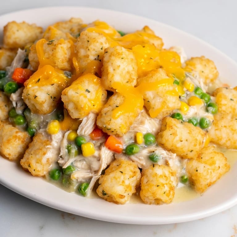 Save to Pinterest A comforting twist on the classic chicken pot pie, topped with crispy tater tots instead of pastry. Budget-friendly, hearty, and perfect for family dinners.