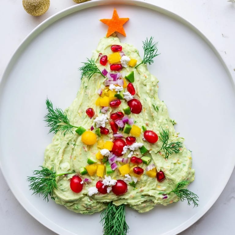 Save to Pinterest A festive, creamy avocado dip artfully shaped into a Christmas tree, decorated with colorful vegetables and fresh herbs. Perfect as a holiday appetizer or centerpiece.